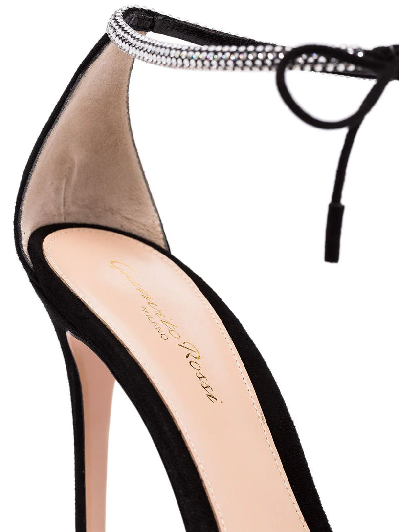 - Tiny crystals enrich the bow tie detailed ankle strap