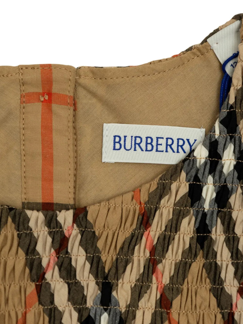 - The smocked style features ruffled trims with intricate picot edging