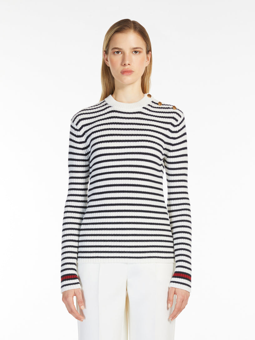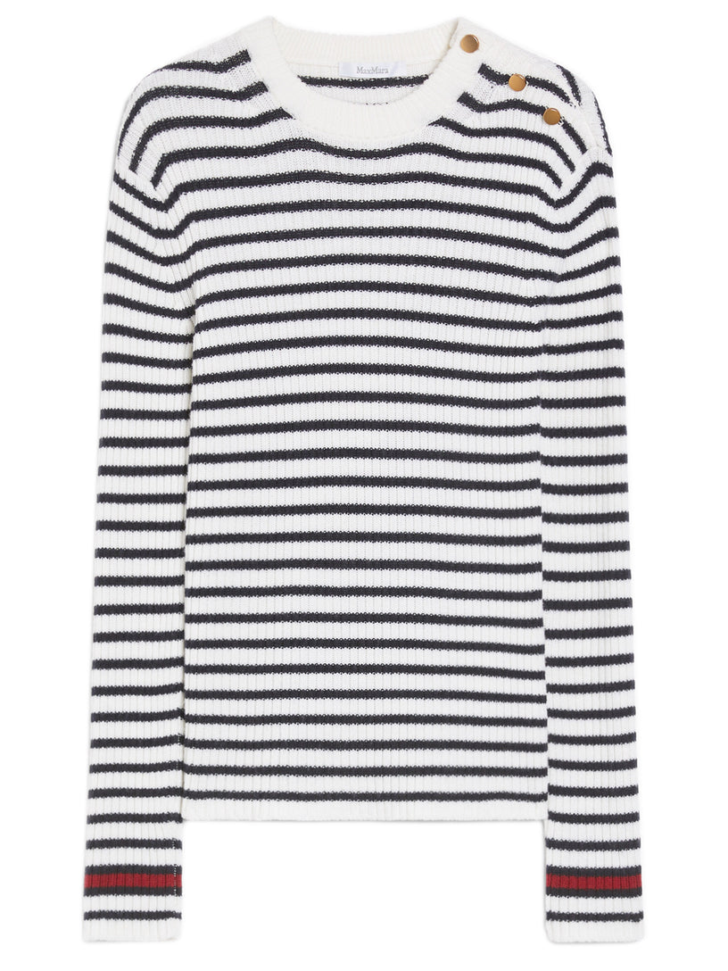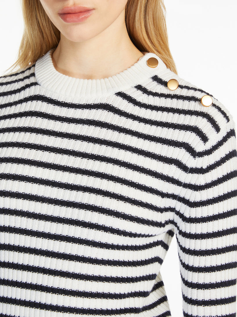 - Tre bottoni in metallo ricamati sulla spalla sinistra indossata, stile marinière