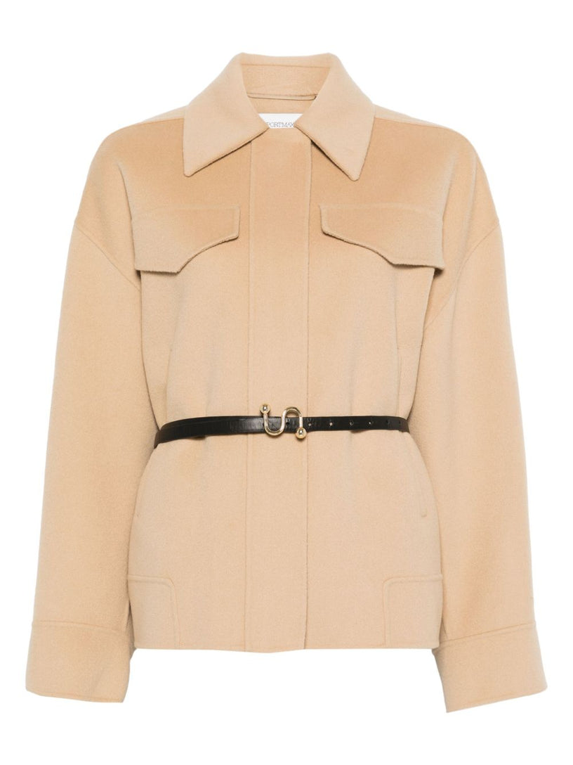 - Tasche inserite con patta sagomata e cintura in pelle con fibbia a S